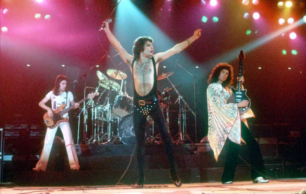 El álbum de 1977 de la banda, News of the World, contenía «We Will Rock You» y «We Are the Champions», que se han convertido en himnos en los eventos deportivos. A principios de la década de 1980, Queen era una de las bandas de arena rock más importantes del mundo. «Another One Bites the Dust» de The Game (1980) se convirtió en su sencillo más vendido, mientras que su álbum recopilatorio de 1981 Greatest Hits es uno de los álbumes más vendidos a nivel mundial con más de 50 millones de copias. En el Reino Unido es el álbum más vendido con más de 7 millones de copias y está certificado como nueve veces platino en los EE. UU. Su actuación en el concierto Live Aid de 1985 y su concierto en Wembley Stadium en 1986 están clasificadas entre las mejores recitaciones de la historia del rock por varias publicaciones.